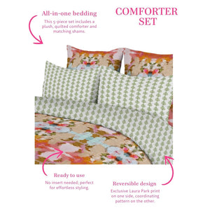 Featuring the exclusive Laura Park print, this reversible comforter offers two distinct looks—an abstract, artful design on one side and a simple coordinated accent on the other. Switch up your bedroom in an instant! The set includes matching shams in standard/king and euro sizes for a perfectly styled bed.