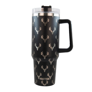 Perfect for the patio, outdoor adventure, or snagging some much deserved downtime in the man cave. Enjoy your favorite hot or cold beverage in this 40-ounce stainless steel tumbler. With a sturdy handle, reusable plastic straw, and screw-on plastic lid with easy-travel straw cover. Yes, it even fits in your car or truck cup holder!