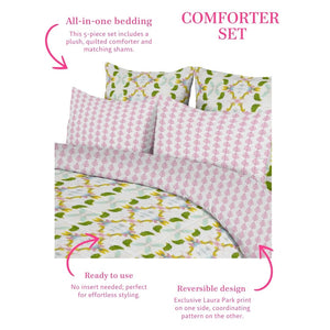 Featuring the exclusive Laura Park print, this reversible comforter offers two distinct looks—an abstract, artful design on one side and a simple coordinated accent on the other. Switch up your bedroom in an instant! The set includes matching shams in standard/king and euro sizes for a perfectly styled bed.