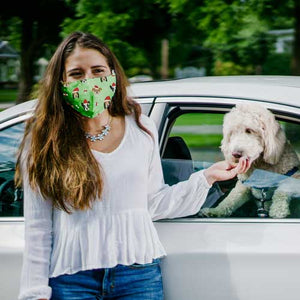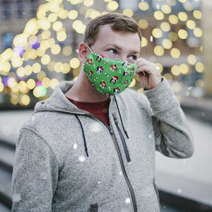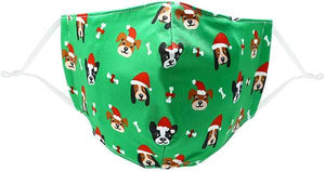 The Santa Dog adult face mask will add a festive spirit to the Holiday Season with smiling dogs in red Christmas caps and bones with ribbons. The reusable 2-layer 100% cotton mask also has a filter pocket (not included). The ear loops are 55% nylon and 45% elastane and feature rubber stoppers to adjust the fit.