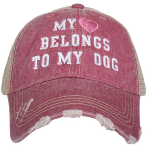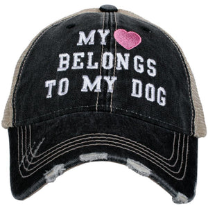 You already know it, now everyone will when you're wearing the My Heart Belongs To My Dog trucker hat. Embroidered white text and pink heart. Available hat colors: