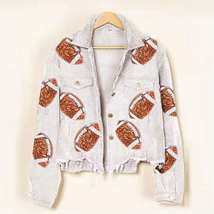 A stylish cropped shacket with eye-catching sequin football patches all over, This is a chic and sporty addition to your gameday ensemble that will have heads turning your way. Available in beige or charcoal, it is a corded cotton fabric with frayed hem. Dress it up or dress it down, this is a must-have addition to your wardrobe.