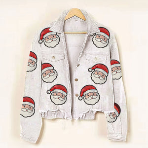 A stylish cropped shacket with eye-catching sequin Santa Claus face patches all over. A chic and sporty addition to your holiday ensemble that will have heads turning your way. Available in beige or charcoal, it is a corded cotton fabric with frayed hem. Dress it up or dress it down, this is a must-have addition to your wardrobe.