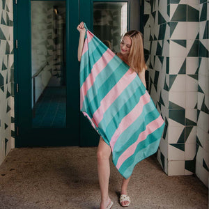 A super absorbent microfiber material that you can easily shake sand and dirt from, then wrap yourself in the soft, eye-catching towel and dry off quickly. Perfect for the ocean-front beach, lake, or just sunbathing poolside.