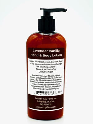Nutrient rich moisturizing and healing body lotion saturated with pure lavender essential oil, sunflower oil, shea butter and aloe vera.  Lotion is quickly absorbed into skin and regenerates skin to a soft, silky smooth and nourished appearance.  This lotion is great for normal to dry skin.  Mineral Oil and Paraben Free.  Cruelty Free/Vegan.